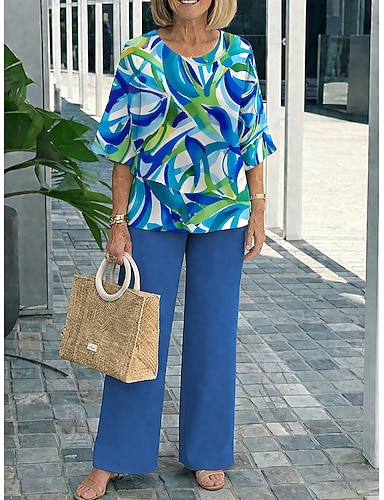 Per donna Set di Pantaloni Manica 3/4 Girocollo Grafico Geometrico Elegante Vacanza Casuale Quotidiano Vacanza Blu Rosso Viola Estate Vestibilità regolare