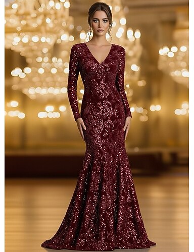 Abito da Sera A-Line Abito Elegante Formale Matrimonio Lunghezza Piante Manica Lunga Collo a V Paillettes con Fessura Paillettes