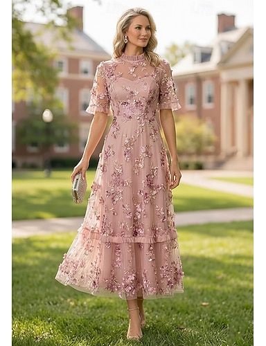 Linea ad A Abito Lunghezza alla caviglia Lunghezza Tè Abito da Cocktail Abito da cerimonia per signora Manica Corta Girocollo Collo Alto Elegante Lussuoso Formale Ospite di nozze Semi-Formale Pizzo