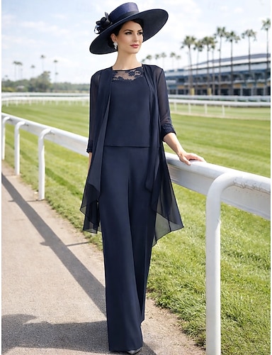 Tuta Completo Pantalone Tre Pezzi Lunghezza al pavimento Abito da cerimonia per signora Manica 3/4 Scollo Tondo Elegante Formale Ospite di nozze Chiffon Pizzo Con Paillettes con Pizzo Paillettes