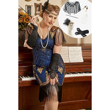 Anni Ruggenti Anni 1920 Lunghezza al ginocchio Vestito Abito Flapper Abiti Taglie Forti Maniche corte Il grande Gatsby Invitato al matrimonio Paillettes Frangia con nappe Scollo a V Costume Per donna