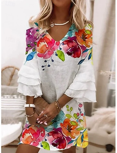 Per donna Mini Abito Abito a Tubino Vestito Estivo Abito a trapezio Vacanza Casual Boho Feste Vestibilità regolare Ombre Floreale Grafico Manica 3/4 Scollo a V Bianco Primavera Autunno