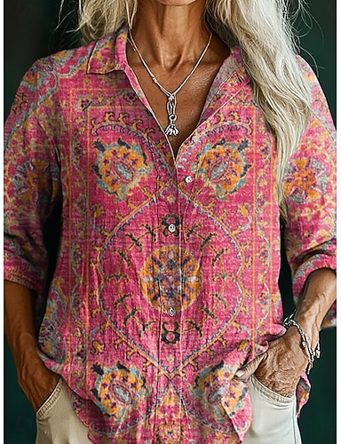 Per donna Camicia Finto cotone e lino Bottoni Stampato Floreale Bohemien Attivo Casual Manica Lunga Colletto a Camicia Top Regolari Quotidiano Ferie Blu Rosa Viola Estate Primavera Autunno