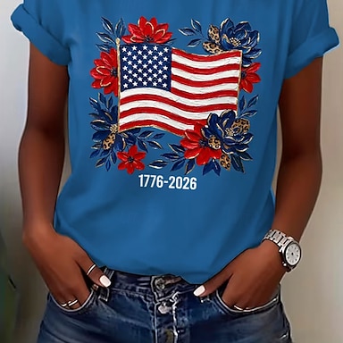 Maglietta Patriottica per Donne per l'Indipendenza Moda Vintage Elegante Manica Corta Collo Tondo Top Regolari Quotidiani Fine Settimana Stampa Blu Bianco Rosso Blu Estate Primavera