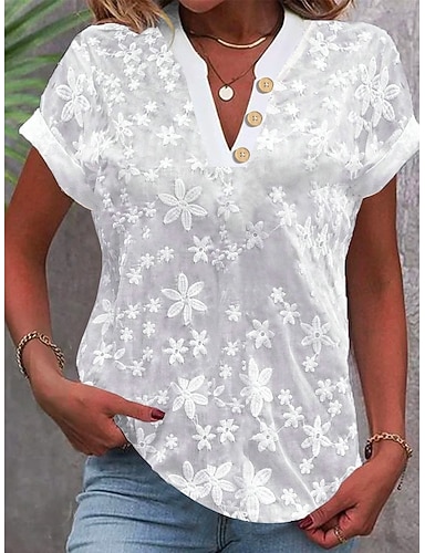 Per donna Top estivi Blusa Top traforato Top in pizzo Arricciato Patchwork Traforato Semplice Elegante Vintage Signore Manica Corta Girocollo Top Regolari Quotidiano Lavoro Ferie Bianco Estate
