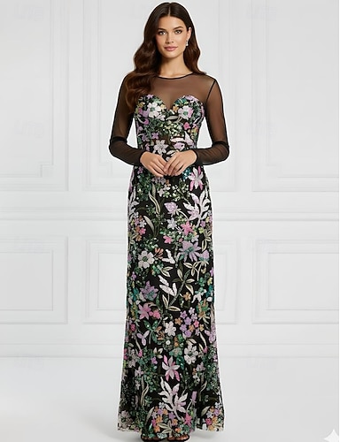 Tubino Colonna Lunghezza al pavimento Perline ricamate Abito Formale Abito da madre della sposa Abito da Sera Elegante Vintage Floreale Manica Lunga Scollo Illusione Matrimonio Formale Con Paillettes