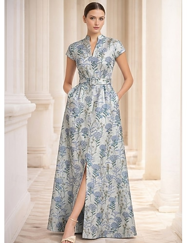 Linea ad A Lunghezza al pavimento Abito da Sera Da principessa Abito formale Elegante Vintage Manica Corta Colletto a Camicia Matrimonio Formale Nylon con Stampa floreale Spacco Tasca