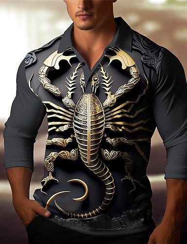 Per uomo Scorpione Polo Maglia da golf Manica Lunga Magliette polo Camicie con Colletto Casual Divertente Abbigliamento da vacanza Abiti da festa Stampa 3D Bottoni Autunno & Inverno Argento Oro