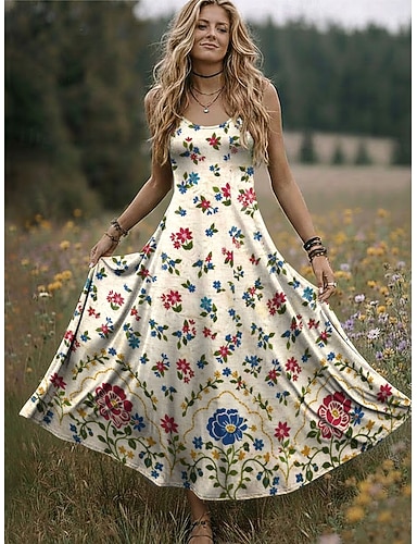 Abito Maxi Donna Boho Abito Estivo Vacanza Casual Spiaggia Vestibilità Regolare Fantasia Floreale Manica Senza Maniche Collo Tondo Marrone Chiaro Arancione Beige Estate Primavera