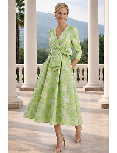 Linea ad A Lunghezza Tè Abiti da Cocktail Elegante Vintage Floreale Manica Lunga Scollo a V Festa in giardino Matrimonio Tasca Jacquard con Stampa floreale Fiocco/Fiocchi