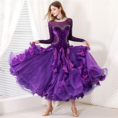 abito da ballo da donna in organza arricciata con strass viola reale, elegante abito da competizione per valzer, tango, foxtrot
