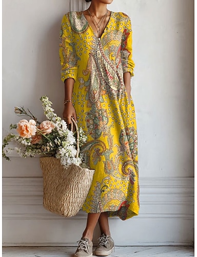 Abito maxi da donna in lino come traspirante leggero abito da sole a linea vacanza casual boho feste vestibilità regolare floreale grafica color block maniche lunghe scollo a V giallo rosa verde