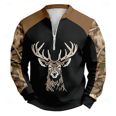 Per uomo Cervo Pile Felpa Moda Casual 3D Da caccia Collo alla coreana Zip a un quarto All'aperto Abbigliamento casual alla moda Vacanza Regalo Marrone Cachi Grigio scuro Grigio Mezza cerniera Autunno