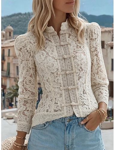 Per donna Blusa Pizzo Tinta unica Elegante Casual Manica Lunga Collo Alto Top Regolari Quotidiano Bianco Primavera Autunno