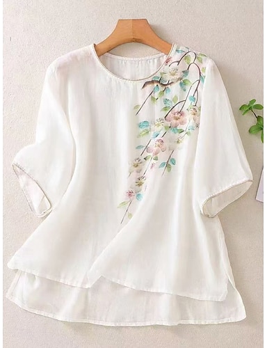 Per donna Maglietta Finto cotone e lino Stampato Floreale Moda Moderno Casual Manica Corta Girocollo Top Regolari Quotidiano Weekend Bianco Viola Cachi Estate Primavera