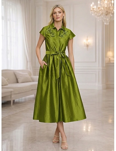Linea ad A Lunghezza Tè Abiti da Cocktail Elegante Manica Corta Colletto a Camicia Festa in giardino Matrimonio Taffetà Raso Elasticizzato con Fiori 3D Fiocco/Fiocchi