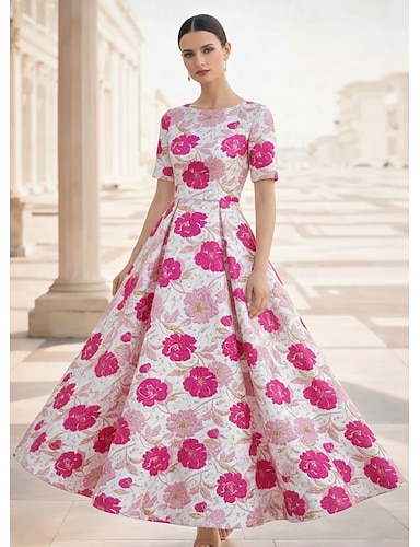 Linea ad A Lunghezza al pavimento Abito da invitata a nozze Abito Floreale Abito da Sera Elegante Vintage Floreale Manica Corta Scollo a Barca Festa in giardino Matrimonio Tasca Jacquard con Stampa