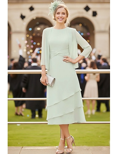 Due Pezzi Linea ad A Lunghezza alla caviglia Abito da invitata a nozze Abito da cerimonia per signora Manica 3/4 Girocollo Elegante Semplice Ospite di nozze Chiffon Con Stola con Drappeggio Balze a