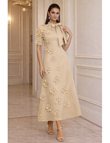 Linea ad A Lunghezza alla caviglia Abiti da Cocktail Elegante Manica Corta Collo alto Festa in giardino Matrimonio Crepe Elasticizzato con Fiori 3D