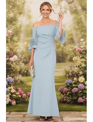 Sirena Tromba Lunghezza al pavimento Abito da invitata a nozze Abito Formale Abito da sera Abiti da Ballo Elegante Mezza Manica Senza Spalle Balli di fine anno Formale Tessuto Elasticizzato con Fiore