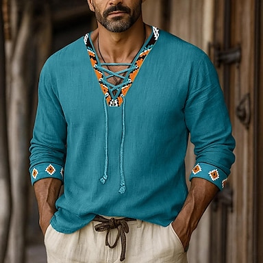 Per uomo Camicia Camicia di lino Stile vichingo Camicia Estiva Camicia da Spiaggia Tinta unica Vacanza Casuale Nero Bianco Verde Manica Lunga Scollo a V Estate Primavera Abbigliamento Coulisse