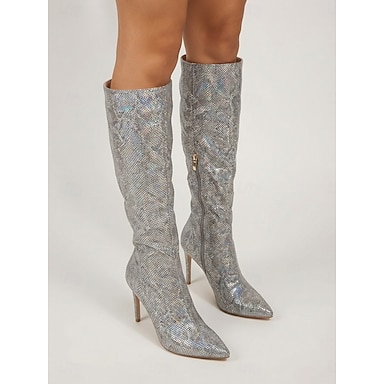 Stivali da donna alti fino al ginocchio con stampa serpente argentata, punta affusolata, tacco a spillo e cerniera laterale, perfetti per la vita notturna, feste e club. &eventi serali