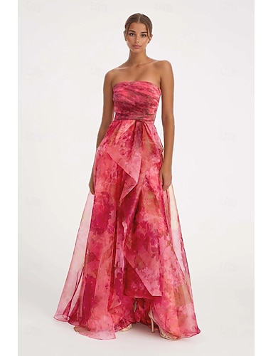 Linea ad A Lunghezza al pavimento Abiti da Ballo Stile Celebrità Floreale Senza Maniche Monospalla Balli di fine anno Festa in giardino Organza con Arricciato Volant Spacco