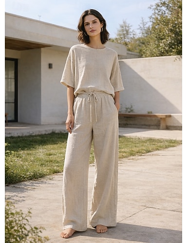 Completo pantaloni da donna in lino al 15%, completo in lino, tinta unita, tasca, elastico in vita, t-shirt, pantalone, casual, a maniche lunghe, girocollo, blu, nero, bianco, blu navy, marrone chiaro, estate, primavera