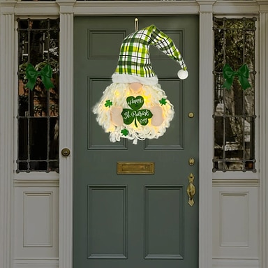 ghirlanda irlandese di San Patrizio con luci a LED, trifoglio, bambola senza volto, gnomo ornamentale, 60x30 cm, veranda interna/esterna, parete, soggiorno, sala da pranzo, decorazione per feste