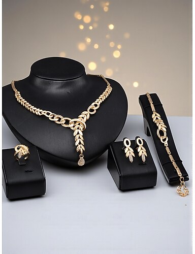 set di gioielli da donna con catena in oro - elegante set composto da quattro pezzi con collana, bracciale, orecchini e anello con motivo a foglia per feste, balli serali o occasioni formali