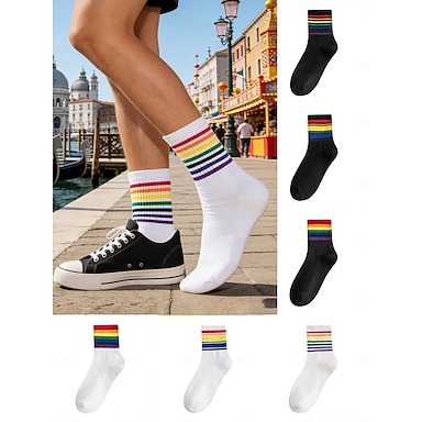 Set di calzettoni crew a strisce arcobaleno di Mardi Gras per donna - Set da 6 calzini casual in misto cotone stile unisex per carnevale festival Pride e abbigliamento da festa