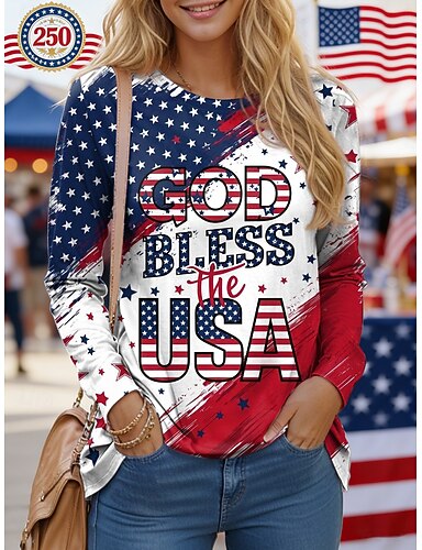 Giorno dell'Indipendenza Maglietta da Donna Patriottica Grafica Bandiera Stile Casual Maniche Lunghe Collo Girato Regolare Top Giornaliero Stampa Blu Bianco Rosso Estate Primavera