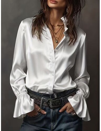 Per donna Camicia Blusa Arricciato Allacciato Volant Tinta unica Semplice Elegante Signore Classico Manica Lunga Scollo a V Top Regolari Quotidiano Lavoro Ferie Bianco Beige Estate Primavera