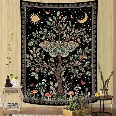 Arazzo da parete vintage con falena lunare, natura mistica, albero della vita con fasi lunari, stelle, fiori selvatici, funghi, decorazione estetica per camera da letto e dormitorio