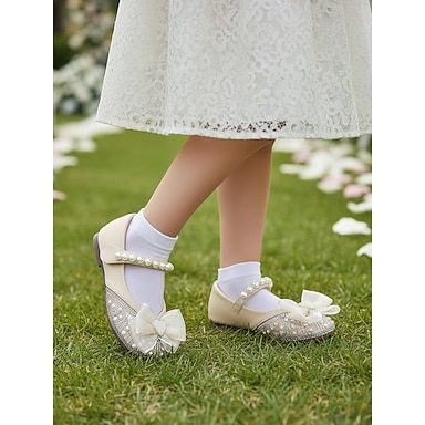 scarpe da damigella con cinturino in perle e fiocco con punta in strass, eleganti ballerine in similpelle per bambine, comode scarpe da sposa con tacco basso perfette per le damigelle