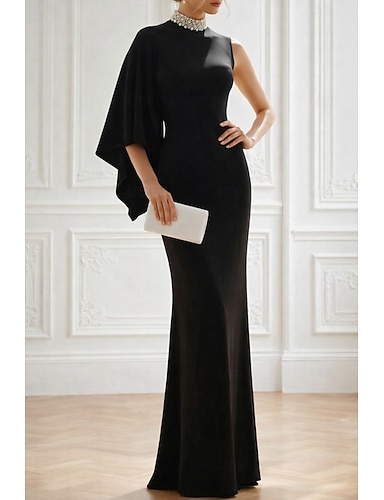Tubino Colonna Lunghezza al pavimento Perline ricamate Abito Formale Abito da madre della sposa Abito da Sera Da principessa Abito formale Elegante Abito Nero Setoso Senza Maniche Monospalla