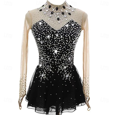 Abito da pattinaggio artistico Per donna Pattinaggio sul ghiaccio Vestito Nero Patchwork Schiena aperta Alta elasticità Allenamento Competizione Vestiti da pattinaggio sul ghiaccio Classico Cristallo