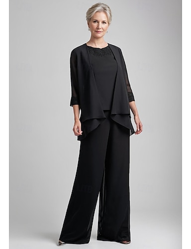Tre Pezzi Completo Pantalone Lunghezza al pavimento Abito da cerimonia per signora Manica 3/4 Girocollo Elegante Semplice Formale Ospite di nozze Chiffon con Pizzo