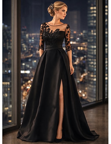 Tubino Colonna Lunghezza al pavimento Abito da invitata a nozze Abito Formale Abito da sera Abito da cerimonia per signora Manica 3/4 Collo gioiello Elegante Ospite di nozze Raso Pizzo con