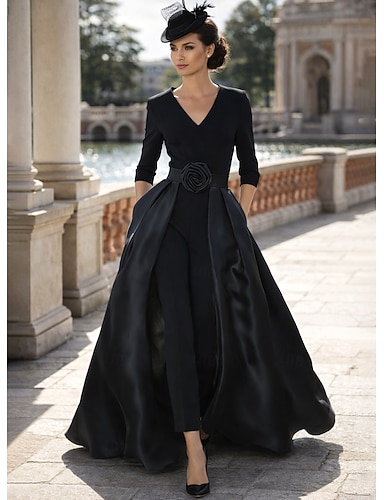 Tuta Completo Pantalone Strascico a Terra Abito da cerimonia per signora Manica 3/4 Scollo a V Elegante Semplice Abito Nero Ospite di nozze Serata Formale Tessuto Elasticizzato con Tinta unita