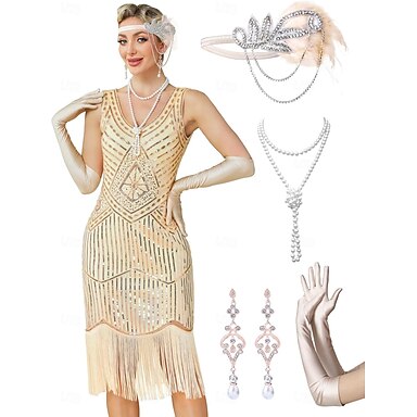 Set Anni Ruggenti Anni 1920 Mini Vestito Abito Flapper Abiti con accessori Senza maniche Il grande Gatsby Taglie Forti Invitato al matrimonio Scollo a V Costume Per donna Carnevale Mascherata Balli