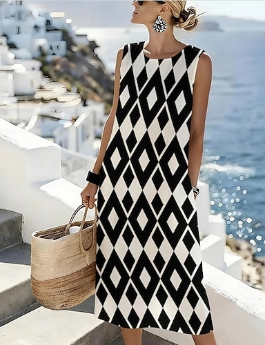 Per donna Abito Midi Abito a Tubino Vestito Estivo Abito a trapezio Vacanza Casual Boho Spiaggia Uscire Vestibilità regolare Grafico Geometrico Senza Maniche Girocollo Nero Estate Primavera