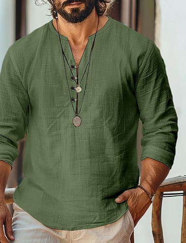 Per uomo Camicia Camicia di lino Camicia Estiva Camicia da Spiaggia Tinta unica Vacanza Casuale Nero Bianco Verde Manica Lunga Scollo a V Abbigliamento Coulisse