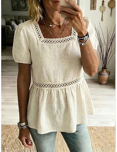 Per donna Blusa Finto cotone e lino Tinta unica Quotidiano Elegante Essenziale Mezza Manica Girocollo Top Regolari Quotidiano Beige Estate Primavera Autunno