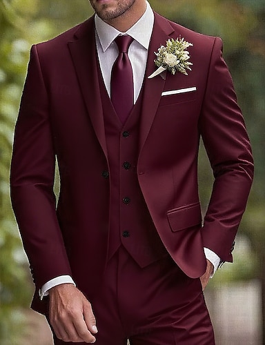 Uomo Smoking Abiti da sposa Matrimonio Borgogna Autunno Tuta Bavero classico Formale Tinta unita Vestibilità aderente 3 pezzi