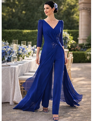 Tuta Completo Pantalone Lunghezza al pavimento Abito da cerimonia per signora Manica 3/4 Scollo a V Scollatura dritta Elegante Vintage Formale Ospite di nozze Chiffon con Arricciato Balze a cascata