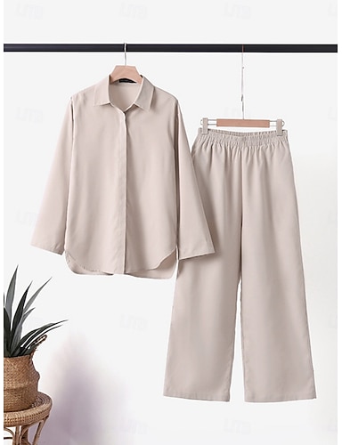 Per donna Set di Pantaloni Finto cotone e lino Manica Lunga Colletto a Camicia Tinta unica Elegante Moda Streetwear Casuale Quotidiano All'aperto Verde militare Blu marino scuro Cachi Estate