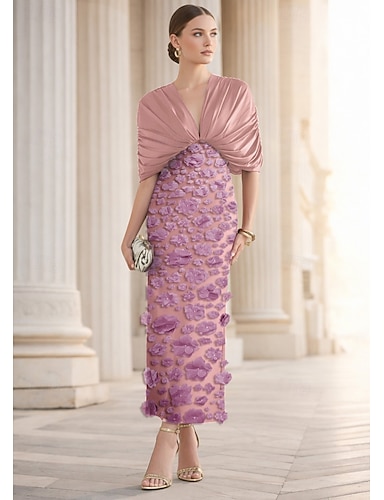 Tubino Colonna Lunghezza Tè Abiti da Cocktail Abiti da festa Elegante Stile Celebrità Principessa Senza Maniche Scollo a V Festa in giardino Matrimonio Pizzo con Fiori 3D Arricciato Ricamo