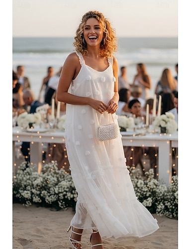 Linea ad A Lunghezza al pavimento Abito Bianco Piccolo vestito bianco Elegante Quotidiano Piccoli Abiti Bianchi Senza Maniche Spalline sottili Matrimonio Schiena geometrica con Fiori 3D