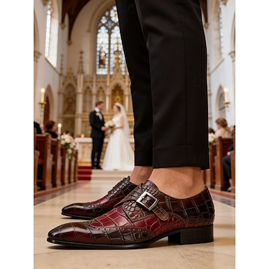 scarpe da uomo in pelle di coccodrillo color bordeaux – design con fibbia di lusso e finitura lucida, ideali per eventi formali, abbigliamento da ufficio, occasioni serali e matrimoni